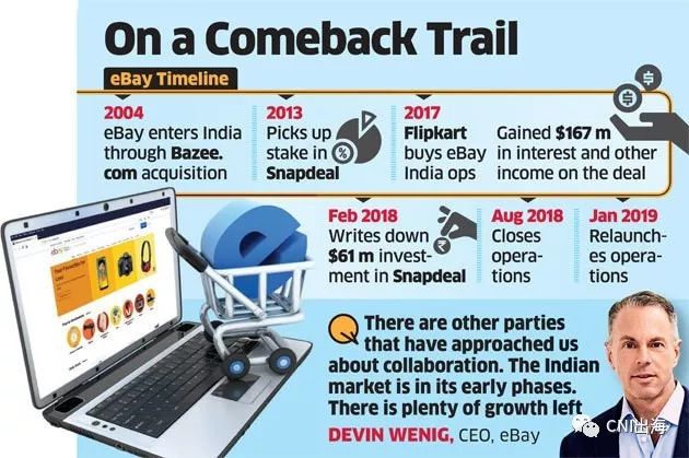 另一方面Rliance和eBay等都有望参与其中。eBay的CEO——Devin Wenig似乎是想借这个机会再度开展印度的业务。eBay早在2004年通过收购baazee.com进入印度市场后,在该市场一直没有突破性的进展,据说2018年7月eBay尝试与ShopClues以及其他的几家电商商议推出专注于印度的门户网站,8月eBay India被关闭。