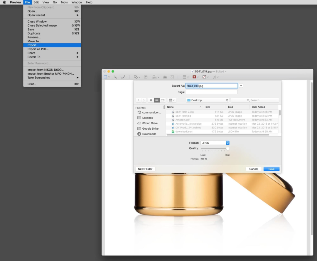 在“Preview”中以100%的质量保存图片后,你会注意到文件大小实际上很大。我们没有在 Preview 压缩图片,是因为我们在这里看不到滑动 JPEG 压缩滑块会产生什么样的结果。