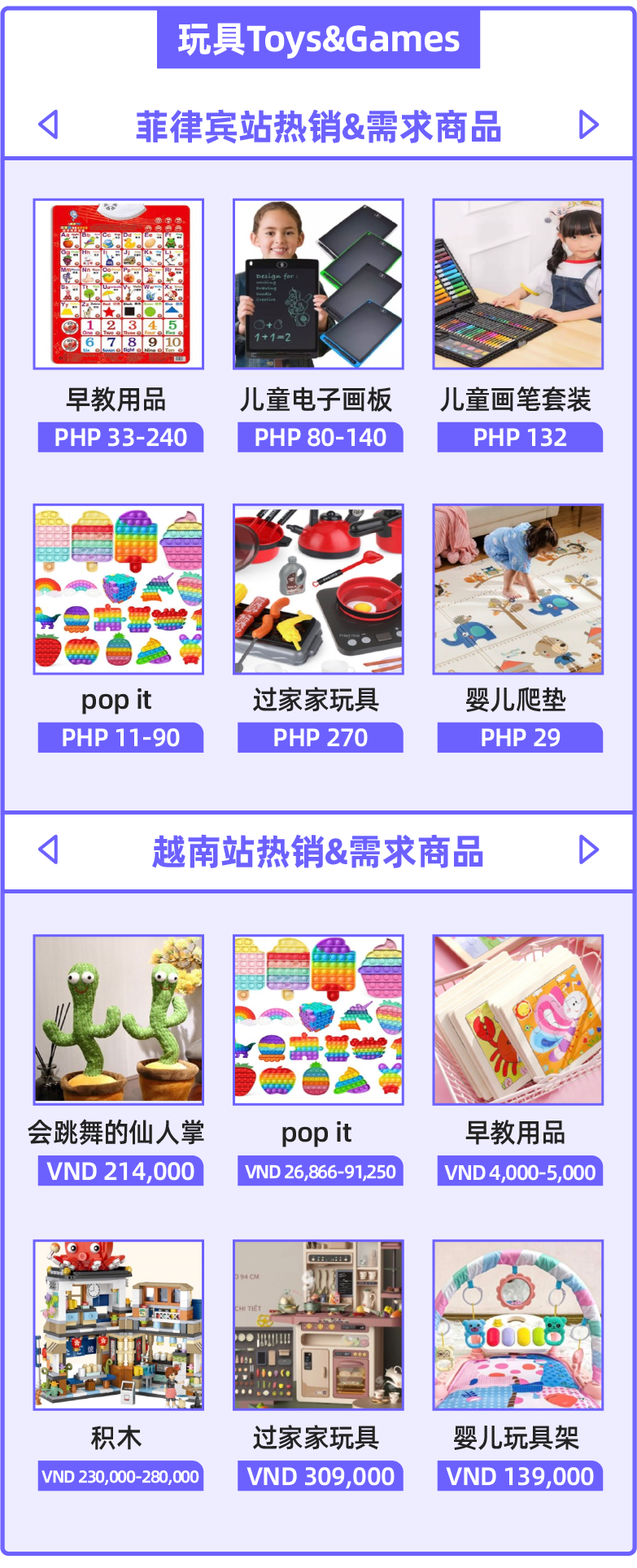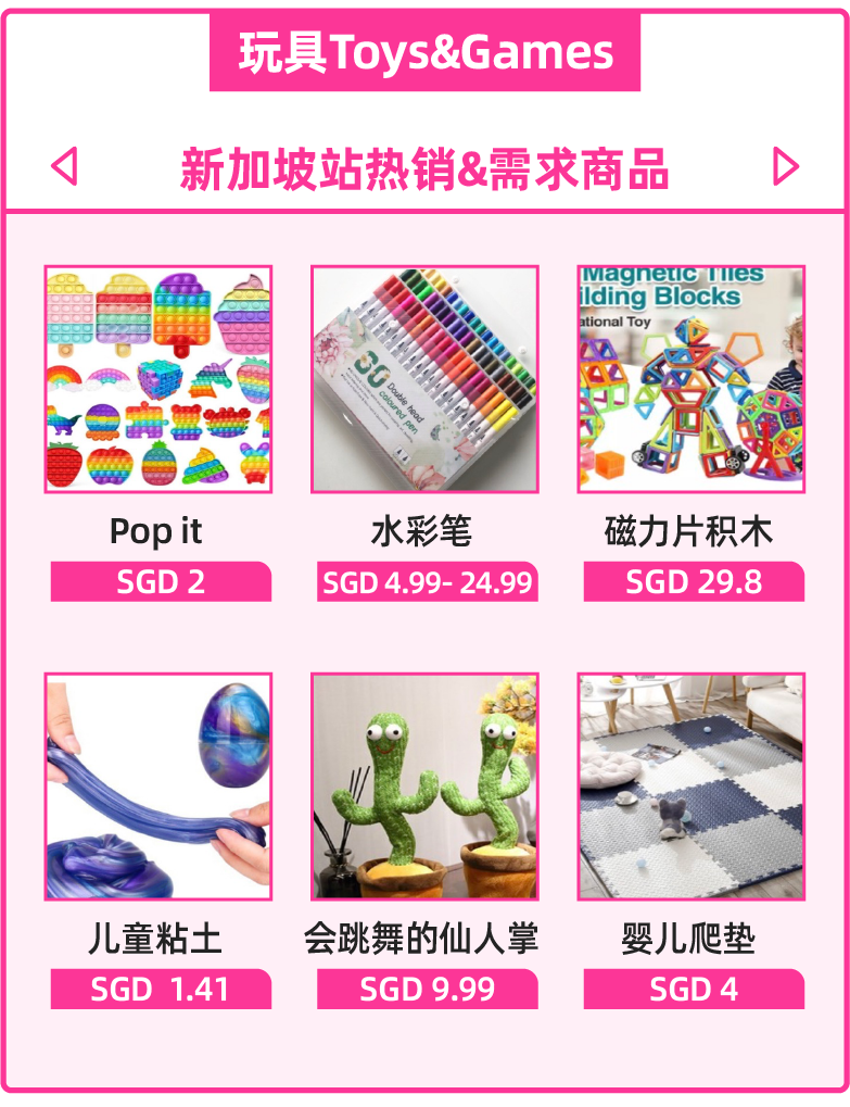 在最新的7月销量动态中,pop it与会跳舞的仙人掌成功登陆东南亚各国市场玩具类目榜单。同时,居家防疫还带动了儿童粘土、彩色画笔的销量上涨。