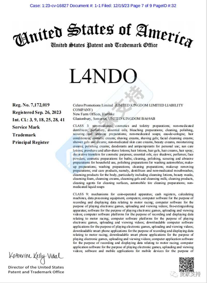 年仅24岁的Lando Norris兰多·诺里斯出生于1999年,年仅24岁,被誉为是史上最年轻的英国一级方程式车手,他以自己出色的表现在赛场上披荆斩棘,屡创佳绩。获得无数粉丝的喜爱,与此同时Lando Norris这个名字也被注册成了商标,并于2023年9月下证。注册大类涉及11个,大到服饰,小到钥匙扣,水杯等,覆盖范围极广。且本次为商标下证后的首次维权,跨境卖家朋友们需注意排查,小心再细枝末节处侵权。