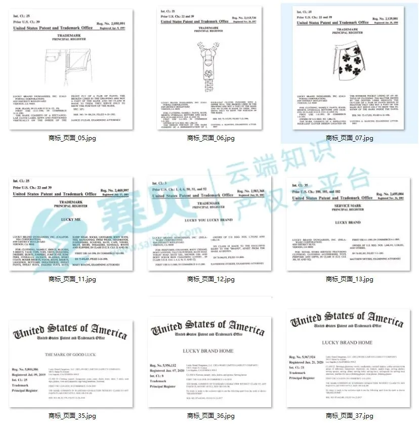 原告 ABG-LUCKY, LLC 持有多个联邦注册商标,文字商标包括LUCKY、LUCKY BRAND、LUCKY YOU、LUCKY ME、LUCKY KID 等;图形商标包括四叶草设计、拉链拉头四叶草图案、口袋内衬四叶草重复图案等。涵盖第 25 类(服装、鞋帽等)、第 3 类(香水、护肤品等)、第 14 类(珠宝、手表等)、第 18 类(箱包、钱包等)等多个国际分类。赛贝提醒跨境卖家,未经授权不得擅自使用,以免引发侵权风险。