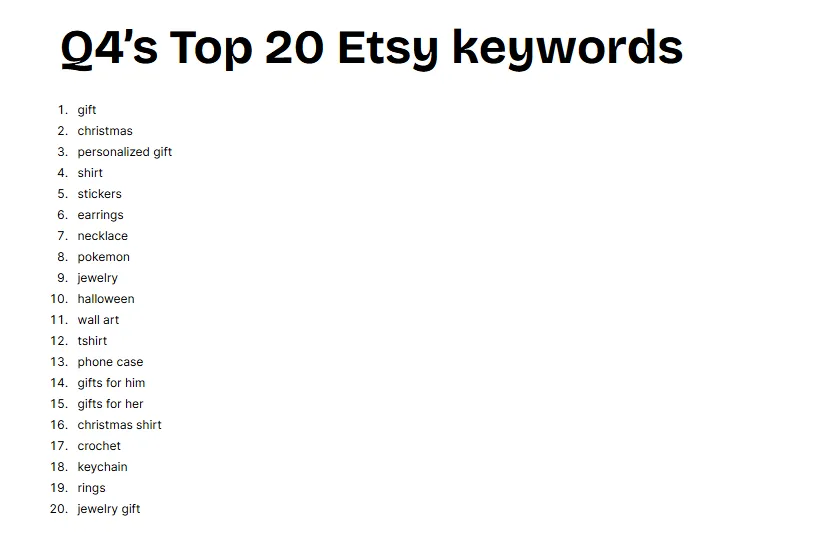 开头就很亮眼:Q4前20个热门搜索里,除了3个,剩下的全是Etsy畅销款!排名第1和第2的“gift”和“christmas”,Q4的点击率都是145%。然后是“giftpersonalized gift”,接下来是五个表现超棒的词:shirt、stickers、earrings、necklace、pokemon。第9名是“jewelry”,再跳过1个,就是三个表现突出的词:wall art、tshirt、phone case。再跳过2个,就是点击率满分150%的“shirtchristmas shirt”,后面跟着“crochet”。第18-19名的“keychain”和“rings”,点击率也都在144%以上。