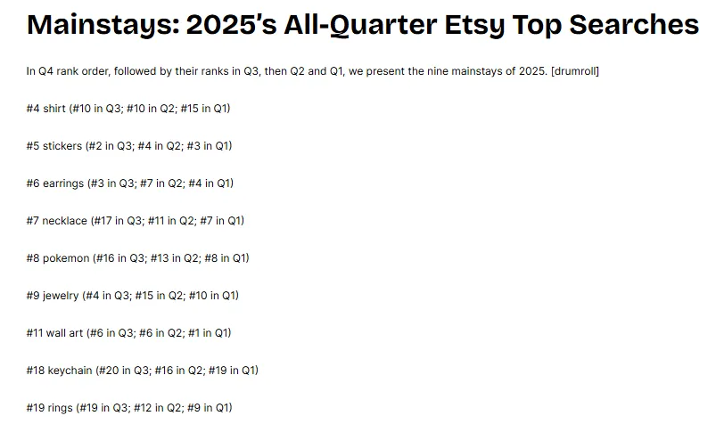 说实话,我超爱拿到这种季度热门关键词列表的!那些因为Etsy促销、网红带动而出现的短期飙升的小冷门、小古怪,都会被抹平,所以季度排名更能准确反映当下的趋势——不管是一时的潮流,还是大家一直都喜欢的经典款。不过今年有点不一样,2025年Q4好像更多的是经典款,没什么特别火的短期潮流。