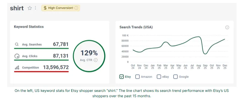 左边是Etsy美国消费者搜索“shirt”的关键词数据,折线图展示的是过去15个月里,美国消费者对这个词的搜索趋势。而且它还一直带着eRank的“高转化率”金pins,这就说明,过去30天里,“shirt”这个词被很多人加入购物车,并且完成了购买。右上角的15个月折线图,能很清楚地对比2024年10-12月和2025年Q4的搜索情况,能看出来,今年10月份“shirt”的搜索量就急剧上升,之后一直保持上涨趋势。