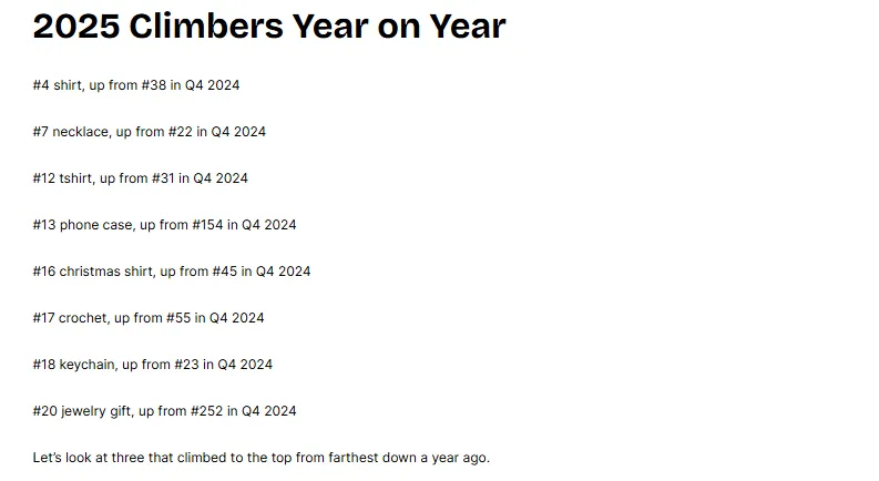 我们每次都会先把当前季度的前20名,和今年之前几个季度的前20名做对比。到了Q4,咱们就能看出哪些搜索词四个季度都在榜单上,这些词我们就称之为Etsy的“中流砥柱”——就像船上的桅杆,不管风浪多大,都能稳稳立住,不让船翻。说起来,2025年的市场风浪确实不小,对吧?