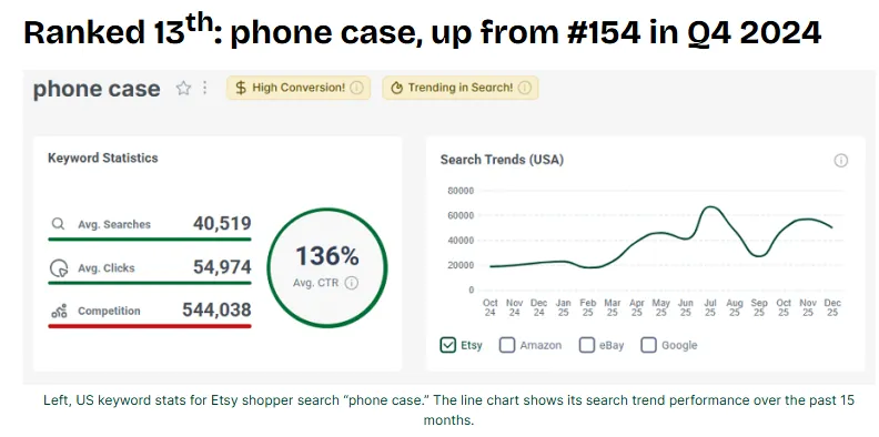 左边是Etsy美国消费者搜索“phone case”的关键词数据,折线图展示的是过去15个月的搜索趋势。“phone case”可是拿了两个金pins哦!一个是本月高转化率,另一个是本周搜索趋势上升。2025年Q4,“phone case”的搜索量超过了15.55万次,比2024年Q4增长了176%。更厉害的是,去年Q4它的点击率(CTR)是100%,今年直接涨到了150%——这说明大家买phone case的意愿超级强!