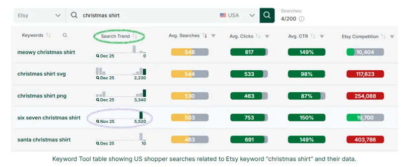 紫色圈出来的是另一个竞争度不高的词:“christmas shirt”(six seven christmas shirt)。“六七”是2025年火起来的一个梗,去年秋天开始在Etsy上流行。这个关键词11月份有5500多次搜索,但要注意,这种单月飙升的词,大家投资之前一定要谨慎,我们不确定2026年11月它还会不会火。