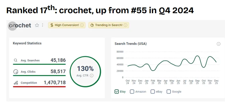 左边是Etsy美国消费者搜索“crochet”的关键词数据,折线图展示的是15个月的搜索趋势。我们在2025年Etsy年度趋势报告里也提到过crochet,它在当时的前20名里也排第17名,我们真的很看好它!有7个和“crochet”相关的搜索词进入了Q4的前1000名,其中4个还在前100名。而且它今年Q4的点击率,从2024年的不到120%涨到了139%,这说明大家买crochet相关产品的意愿特别强!