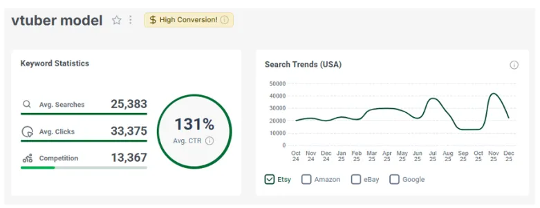 左边是Etsy美国消费者搜索“VTuber模型”的关键词数据,折线图展示的是15个月的搜索趋势。它也有eRank的高转化率金pins,说明过去30天转化率很高。我们在之前的汇总里也提到过这个细分领域,不管你是想找Etsy卖货灵感,还是想知道什么卖得最好,我们都觉得这里有很大机会!趁现在竞争度还是绿色,赶紧入局!