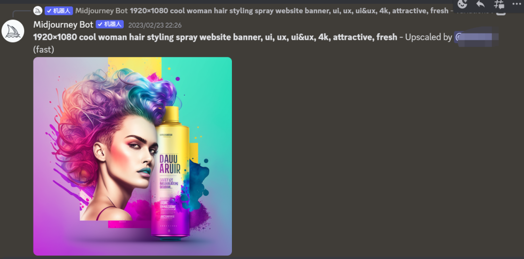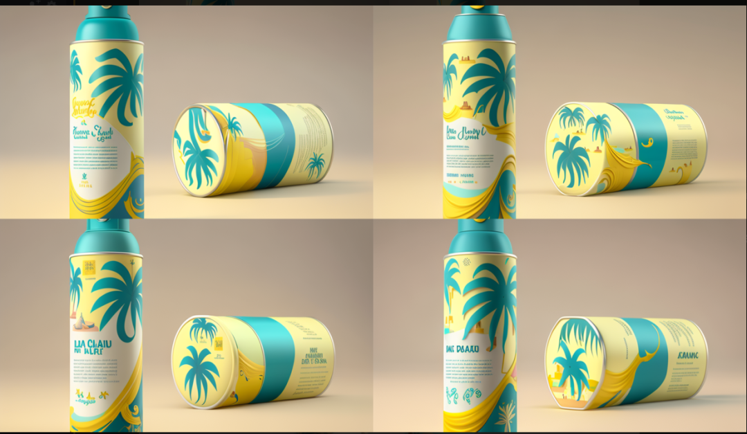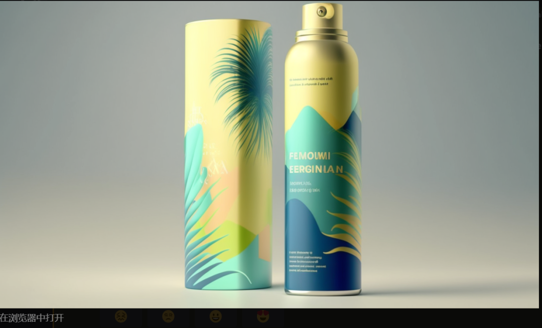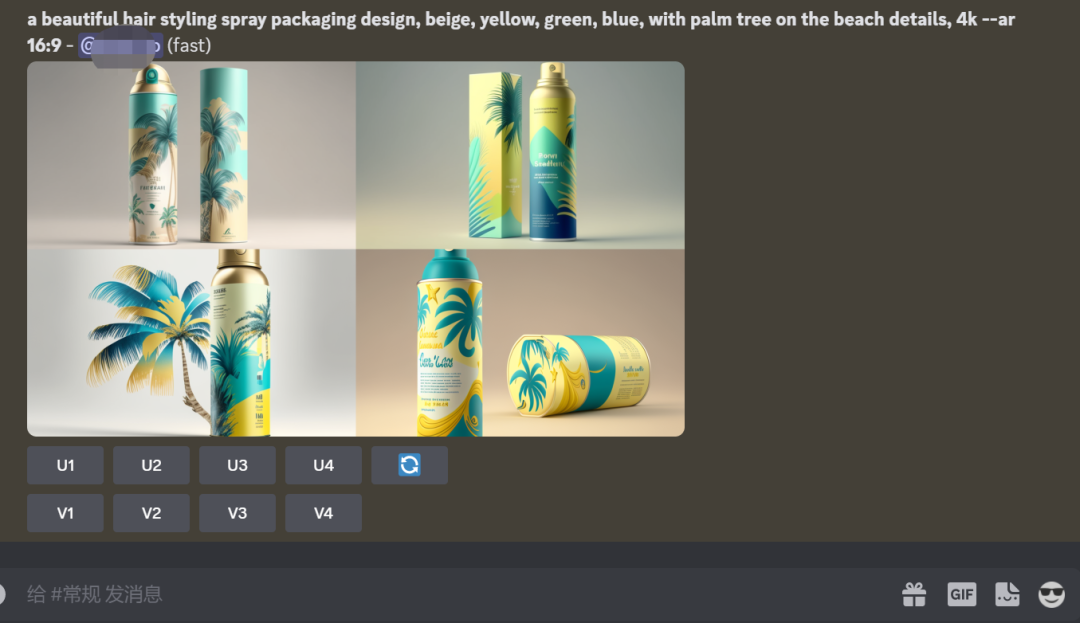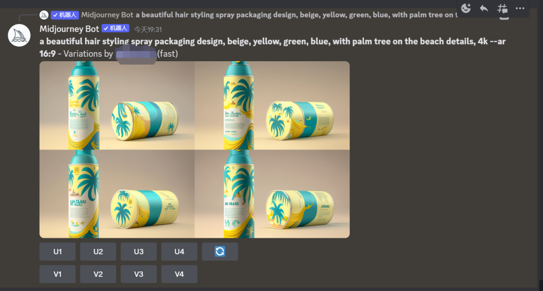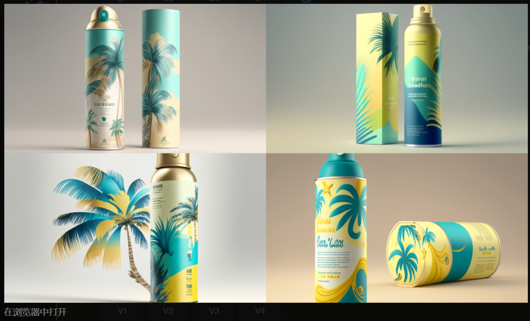 点击V2,会生成同一风格的裂变图片,在这基础上也可以同时进行Upscale或者Variation。了解基本操作,可以让Midjourney自动产图了。再经过简单的PS处理下就可以作为Banner了,请见谅本人拙劣的PS技术。产品图,输入/imagine prompt a beautiful hair styling spray packaging design, beige, yellow, green, blue, with palm tree on the beach details, 4k --ar 16效果还是很不错的,保存清晰图可以点击在浏览器中打开图片再另存到电脑。