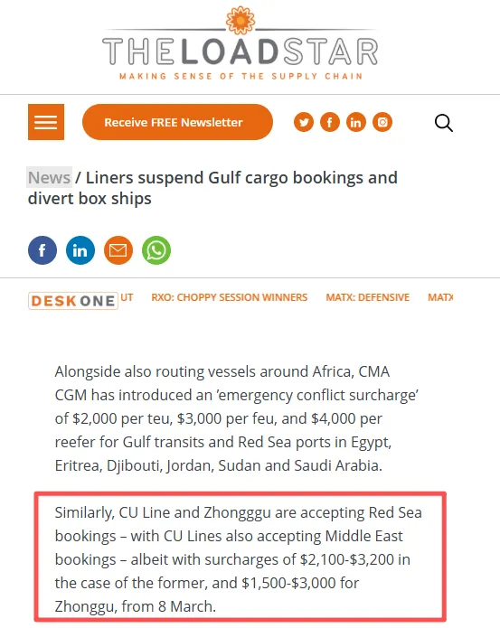 不过,据《Loadstar》报道,在多家大型班轮公司暂停或收紧中东航线之际,中联航运(CU Line)与中谷海运已开始重新接受红海航线订舱,其中CU Line同时开放中东航线预订。不过,两家公司均加收高额附加费:自3月8日起,CU Line加收2100-3200美元不等的附加费,中谷海运加收1500-3000美元。