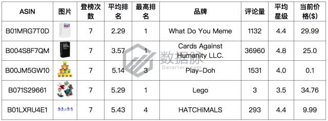 2017年9月11日至2017年9月17日共有617款商品登榜亚马逊Toys & Games品类的相关榜单,其中涉及品牌数281个。截至2017年9月17日,登榜商品总评论数达404995条,平均星级4.33星。