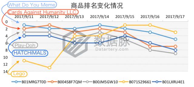 可以看到,在上周Toys & Games品类的Best Seller榜单中排名前五中,骆探长(shujumai.com)发现,各个商品排名于2017年9月16日起均有不同程度下挫,但依然表现为两款卡牌游戏的冠亚军之争,来自品牌的What Do You Meme娱乐游戏卡牌表现更胜一筹,凭借平均排名2.29的成绩击败Cards Against Humanity LLC.反人类卡游戏,荣膺综合排名首位;