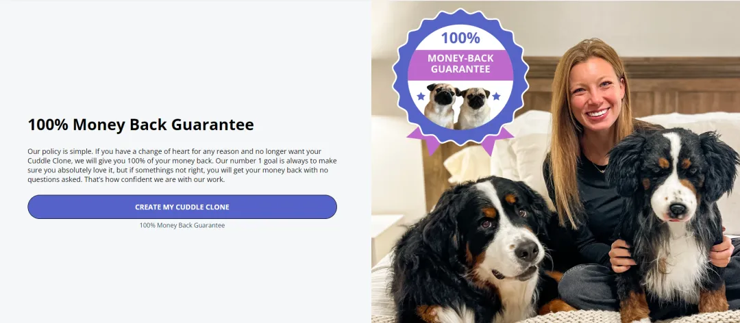 不可预览带来的不确定性,也是阻碍用户下单的一大阻力。用户无法在下单前看到成品,所以他们不仅会担心维权成本,还会担心情绪再次受挫。为此,Cuddle Clones提供了极为明确的售后承诺:100%退款保证、无理由,并反复强调实际退款率低于2%。这一承诺不仅写清了规则,更通过高频露出,传递出对自身工艺与结果的高度自信。