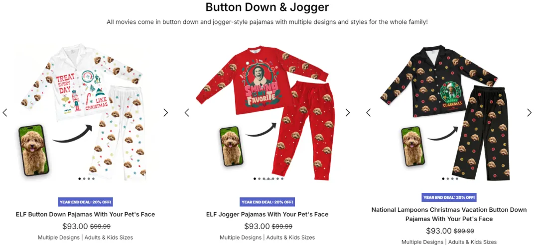 Cuddle Clones通过定制宠物形象与经典电影IP结合,推出联名睡衣系列,并同步覆盖成人、儿童及全家款式,把产品自然嵌入节日、家庭陪伴与仪式性场景之中。这些产品不仅保留了定制的情感属性,还具备“可穿、可晒、可纪念”的使用路径,使消费者更容易在脑海中预演购买后的具体体验。