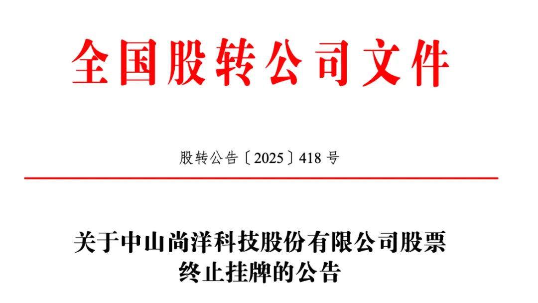 根据公告,尚洋科技公司股票自 2025年11月27日起终止在全国中小企业股份转让系统挂牌。