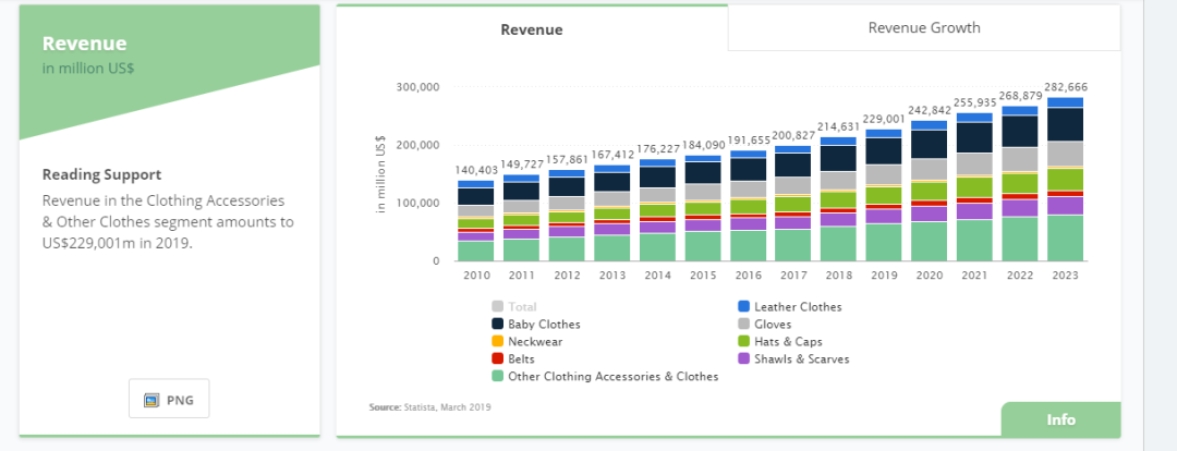 2019年,服装配件及其他服装部门的收入达到229,001万美元。预计市场每年将增长5.4%(2019 - 2019年复合年增长率)。