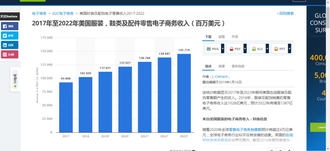 根据statista,我们可以看到2017-2022年美国服装、鞋类及配件零售电子商务收入一直稳步增长,美国服装电子商务市场活跃,服装和配饰也是美国最受欢迎的电子商务类别。