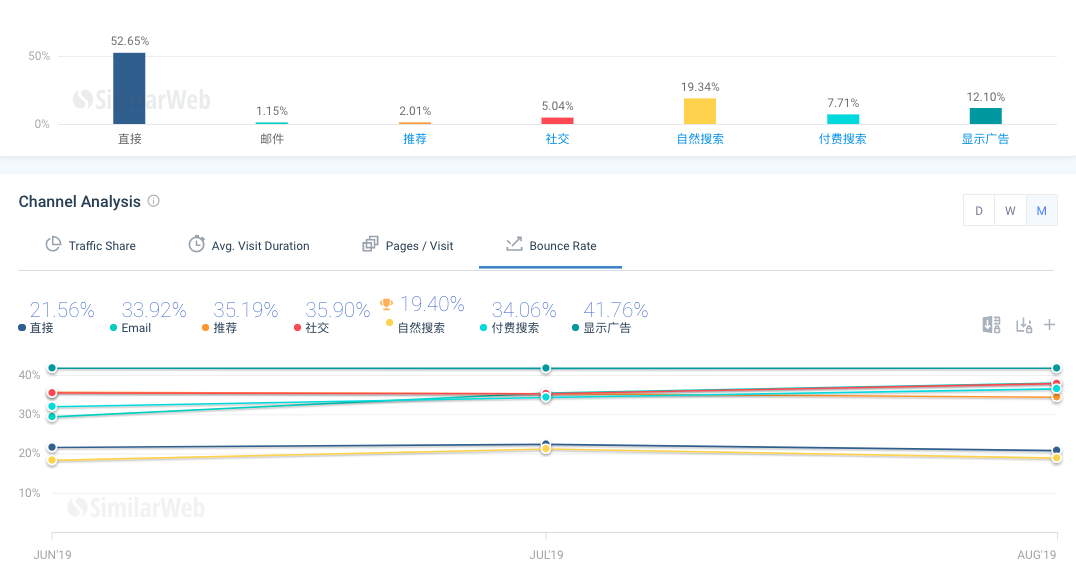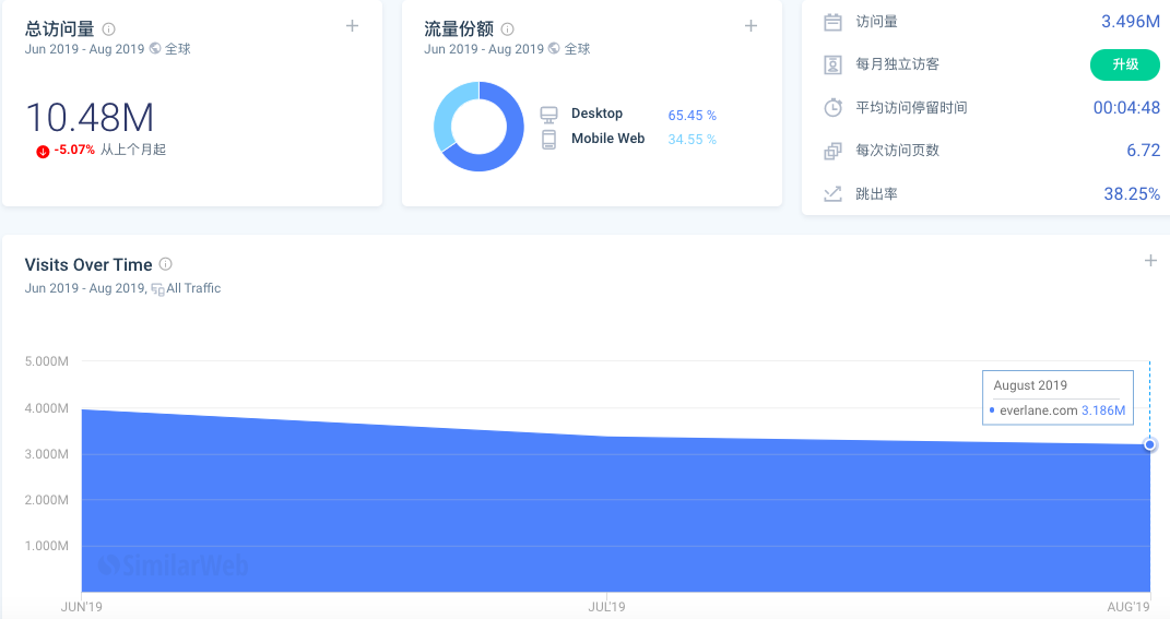 Everlane自营网站的浏览量虽然在8月份呈现了缓慢下滑的状态,总浏览人次达到318万,平均浏览时间将近5分钟,平均浏览页面接近达到6页,网站跳出率38.25%(非常优秀)。消费者群体大部分分布在美国,占总消费人群的75.84%。研究员观察到,网站的设计非常简单明了,符合品牌调性「性冷淡」的感觉。网站和产品设计风格的统一,不断强化着消费者对于品牌的印象,让消费者一看到这种简约的设计元素,第一个就会想到Everlane这个品牌。