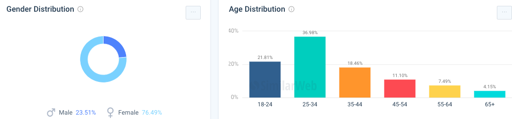 品牌网站访问者以25-34岁轻熟女性为主,Instagram、Snapchat 社交平台与Everlane品牌用户属性和简约清新的调性相符,几张简约大气高颜值的产品照足以吸引眼球,给用户留下品质调性不错的好印象。时效性强、互动程度高的社交媒体成为了 Everlane 第一时间发布产品信息的平台,主要用户也是 Everlane 长久以来聚焦的千禧一代年轻人群。