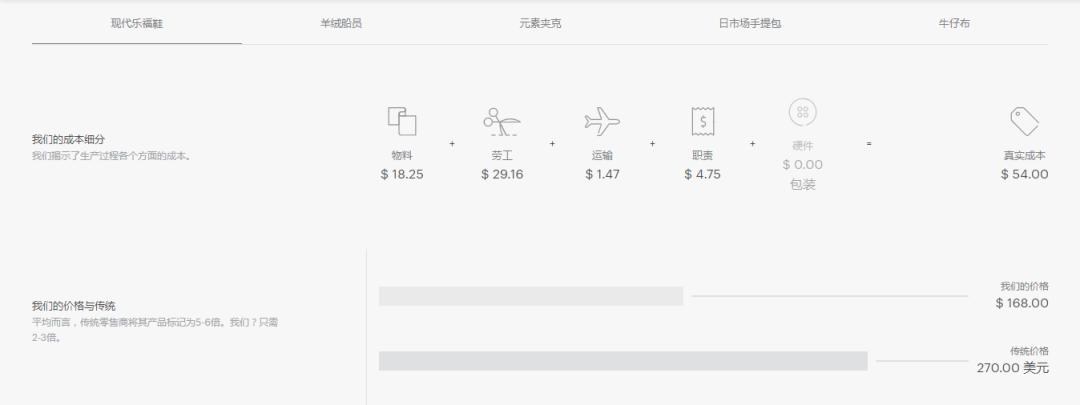 让我们另外举个例子:在 Everlane 的网站上,一双夏日经典款式的凉鞋售价为 105 美元。同时,网页上还会清晰的标注:皮革材料 20 美元、五金 0.8 美元、人工制作费 20.2 美元、运输费 6 美元。最终,制作一双凉鞋的成本价是 47 美元。这样一双鞋在 Everlane 的售价是 94 美元,但在传统零售商标价是 200 多美元。