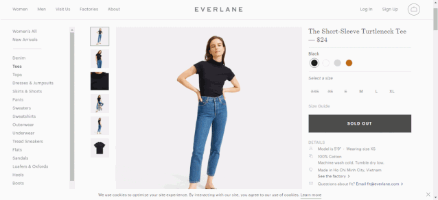 除了在定价上做到透明,Everlane 还把所有商品的产地、原材料、制造工厂等基本信息向消费者公开。假设研究员对生产这个纯色高领T恤的工厂归属地感兴趣,只需点击“查看工厂”就可以查看。