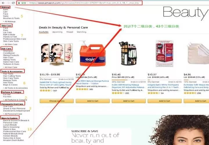 那么这些卖家转型变化之后的玩法和模式是怎样的呢?新的模式就是尽可能的垂直化选品,深挖一个垂直细分的产业带,如下图所示,其实每一个亚马逊的三到四级子类目,都是比较适合去作为垂直类目选品的方向。以后选品的方向应该是尽量选准一个垂直领域,品牌也尽量和这个垂直领域有一定的相关性和品牌故事。然后等到慢慢垄断霸屏这个垂直细分类目后,再慢慢根据这个垂直类目往外扩展。简单来说就是深耕一个垂直类目,比如说我只做化妆刷这个垂直细分类目,尽可能去实现类目霸屏和产品垄断,尽可能实现垂直类目的品牌化,然后再慢慢往外美妆其他产品线去延伸。