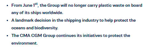 作为全球最大的货柜运输公司之一,这家总部位于法国的航运公司目前每年运送相当于约5万个标准货柜的塑料废物。CMA CGM相信,其措施将有助于防止此类废物被出口到无法确保分类、回收再利用或无法回收的目的地。因此,达飞集团决定在其具备运作能力的情况下采取切实可行的步骤,并积极响应非政府组织要求对海洋塑料采取行动的呼吁。