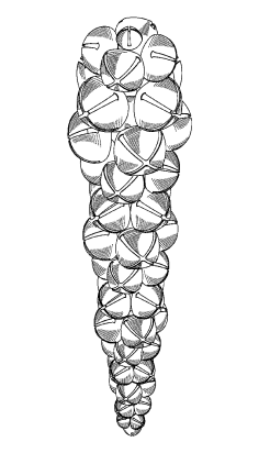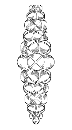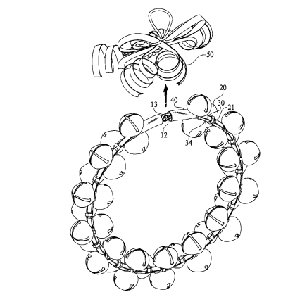 该花环采用非圆形金属丝连接铃铛,其中在相邻的铃铛组之间添加额外的定位构件进行分离。定位件的非圆形内孔可获得定位件与金属丝之间的固定位置,防止定位件的任意旋转。定位构件的外缘包括至少一个夹角,并形成与端面协调的倾斜导向面。这使定位构件端插入钟环凹处,获得定位构件与钟之间的固定位置关系,防止钟任意旋转。本发明通过钟的定位构件与金属丝结构,能够真正保持连接钟的图案。