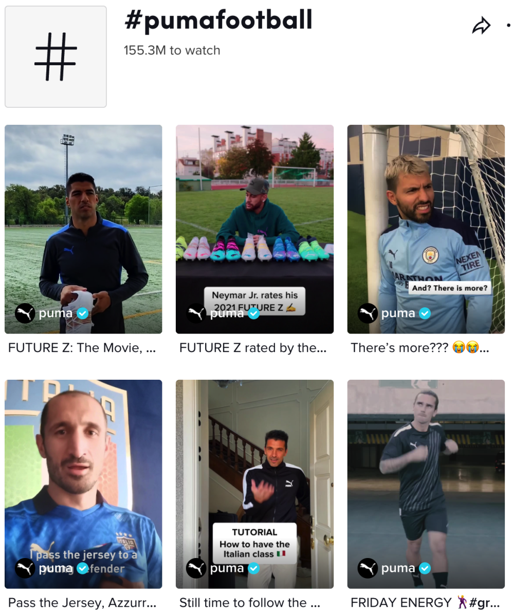 PUMA在Tik Tok上采用组合营销玩法,首先设立了品牌#pumafootball依托新颖的广告形式和内容设计来吸引潜在用户,激发消费者的模仿欲和创作欲,让用户发挥想象力去拍摄作品,最后使用品牌标签在TikTok平台上发布。