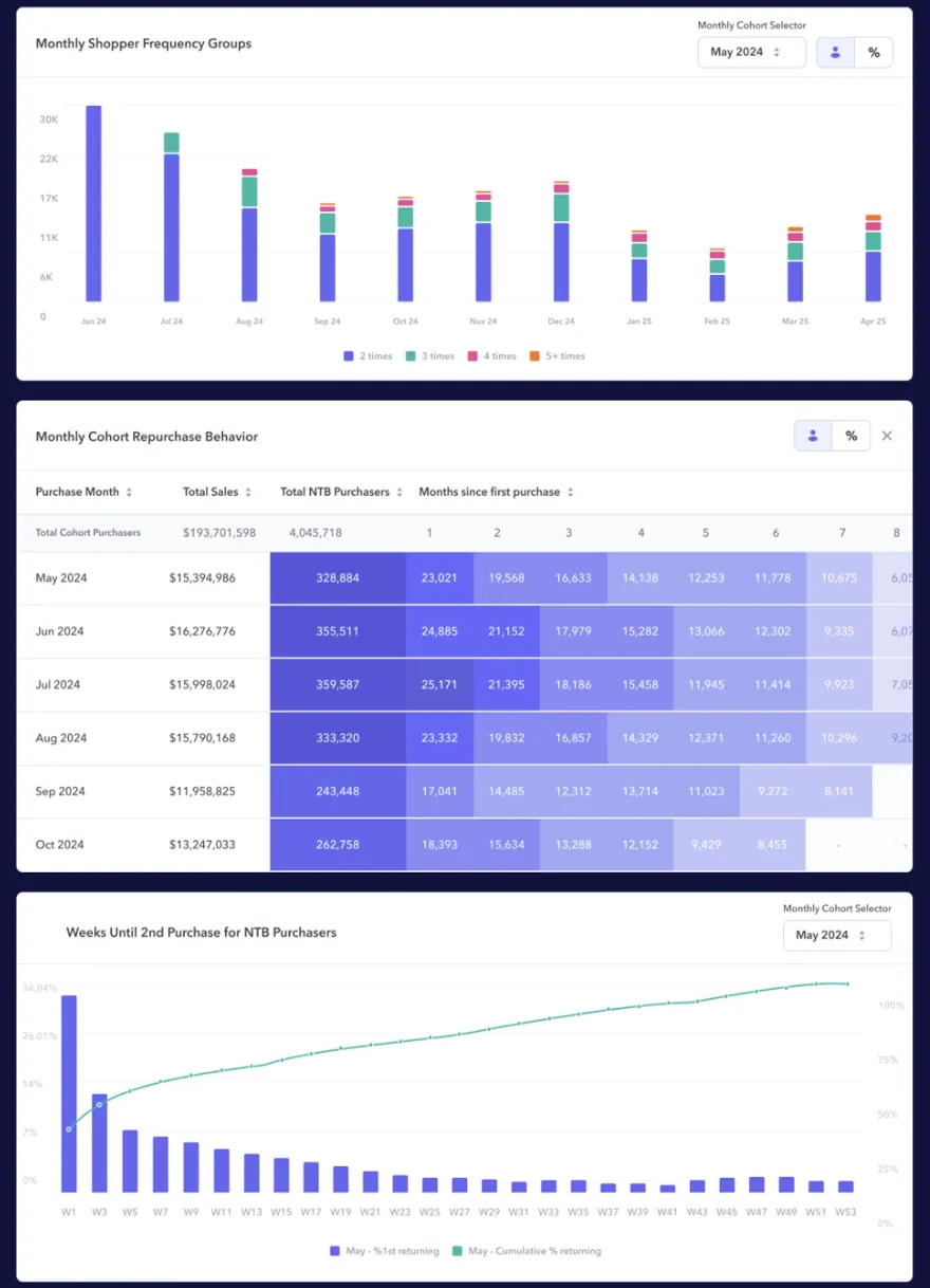 通过CTV建立认知后,下一步是判断哪些家庭值得继续投入,又该如何持续保持曝光。这正是Flywheel飞未消费者长期价值(CLTV)仪表盘的价值所在。基于5年的AMC购买数据,该工具能清晰呈现: