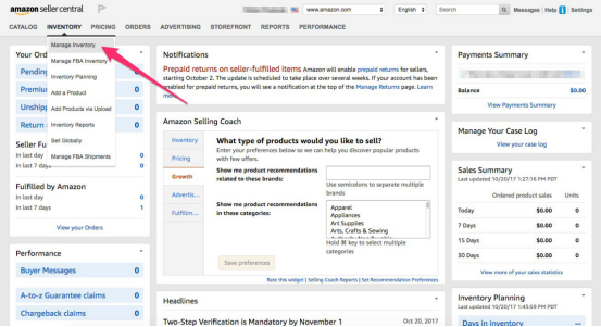 首先,在卖家中心找到“Inventory ”选项,点击“Manage Inventory”: