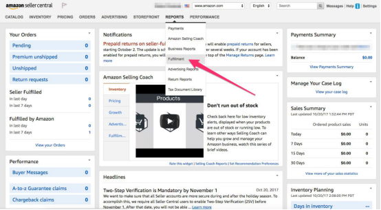 在卖家中心,找到“Reports”,点击“Fulfillment”选项。