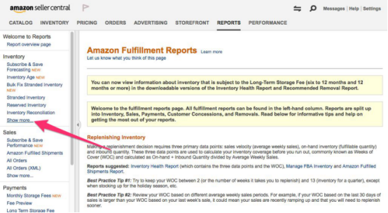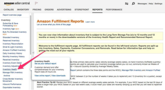 另一种快速辨别有可能缴纳长期仓储费的方式是,使用卖家中心的“Inventory Health”报告。按照以下步骤获取该报告: