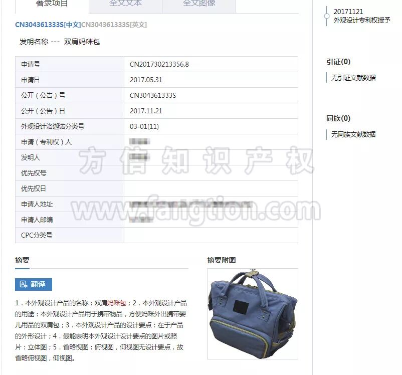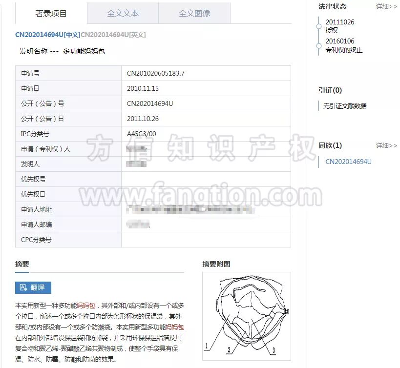 在外观专利方面,申请授权的更多了,卖家们可以登录http://cpquery.sipo.gov.cn/ 注册用户进入公众查询,查询“妈咪包”获取更多的外观设计专利信息。小编摘录了一款较常见妈妈包外观设计。(见下图)