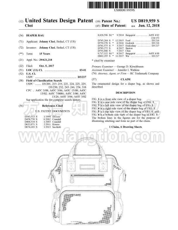 在美国,“diaper bags” 相关的专利,经过筛查有一个外观设计专利和一个发明专利需要特别注意的。