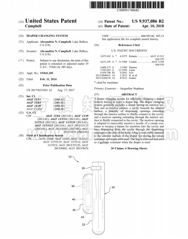 美国发明专利是关于妈妈包充电系统(diaper charging system),授权日期为2018年4月10日,专利号为9937086(详情见下图)