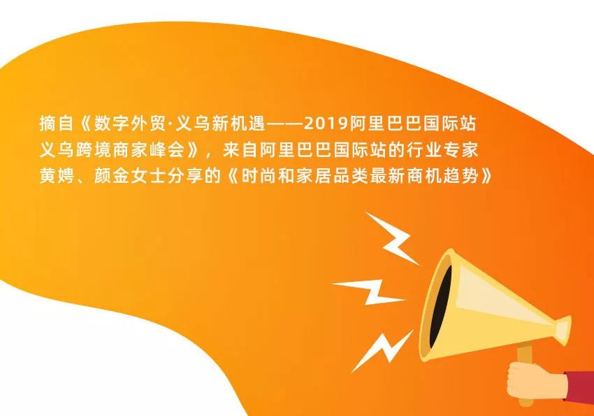 在数字外贸·义乌新机遇——2019阿里巴巴国际站义乌跨境商家峰会上,来自阿里巴巴国际站的行业专家黄娉、颜金女士分享了关于时尚和家居品类的最新商机趋势。