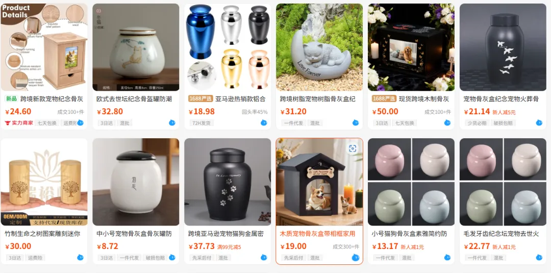 1.溢价能力翻倍:国内成本 80-150 元的定制化骨灰盒,海外售价可达 129 美元以上,溢价空间 5-8 倍,而且欧美消费者愿为 “宠物最后的归宿” 支付 400% 以上溢价(数据显示,92% 的海外宠物主人会为殡葬用品支付超 150 美元)。