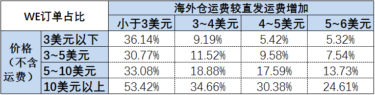 在海外仓运费的设置上,我们建议海外仓运费相比直发运费增加不要超过5美元,尤其是对于低客单价的产品。根据Wish Express海外仓数据统计,在各个价格段下,不同海外仓运费与直发运费的运费差带来的WE订单占比如下: