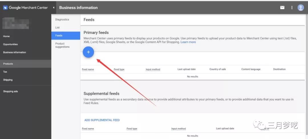 如下图所示,在Google Merchant Center后台点击左侧的“Products”选项,并选择“Feeds”。点击蓝色+