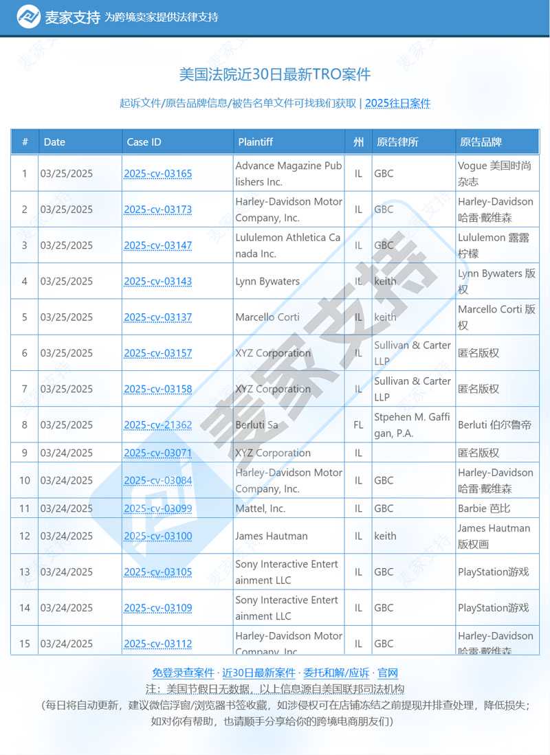 数据驱动决策:麦家支持行业首创并自建了【美国TRO案件数据库】,该数据库自2020年起已收录超过6000件案例,深度分析上千个原告品牌及TRO常规律所的动态。不仅提供详尽的TRO常见问题解读,更搭建了跨境侵权TRO万人交流社群,让跨境卖家的每一步决策都能基于最全面、最专业的数据支持。