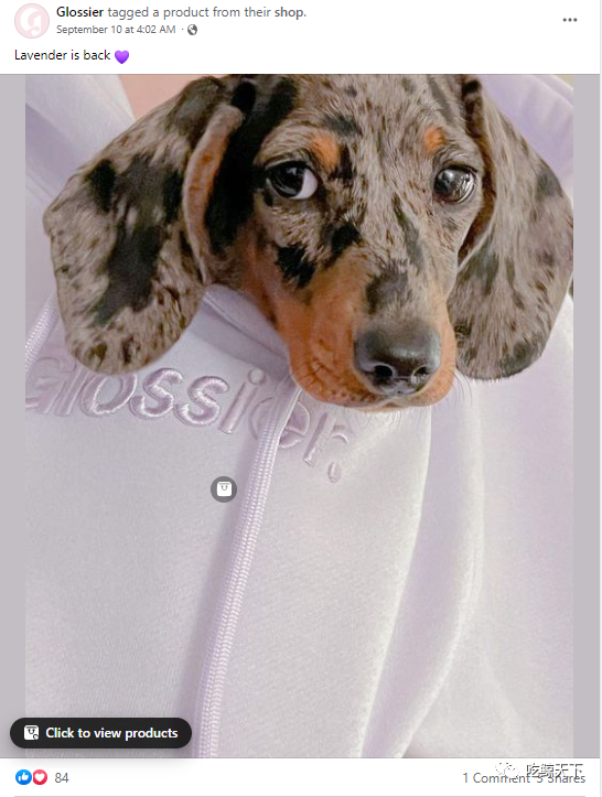 Glossier在Facebook上,累计粉丝39.7万,其主要内容包括产品的宣发、粉丝使用的回馈图、折扣信息、一些与产品相关搞怪的表情包等等。同时用「色彩」和「萌物」元素跟产品连接。比如会用羊驼和典型的Glossier色+污点跟受众的日常生活连接;比如用小狗+打折预告等等。