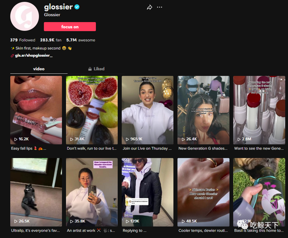 Glossier自2020年加入TikTok,创建官方账号@glossier并认证蓝V企业号,账号累计粉丝30万左右。