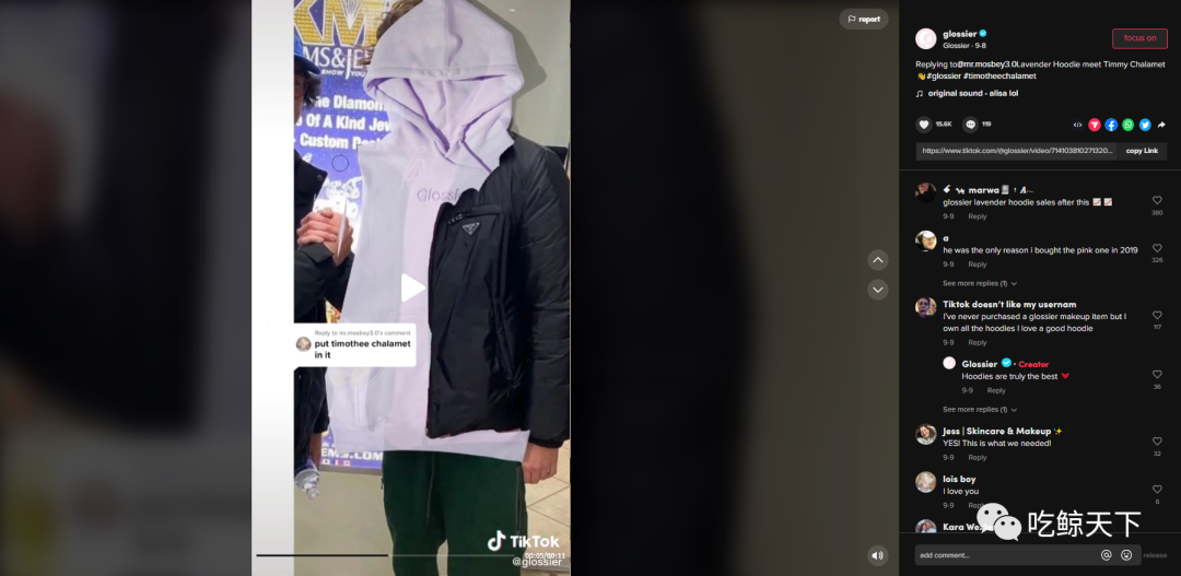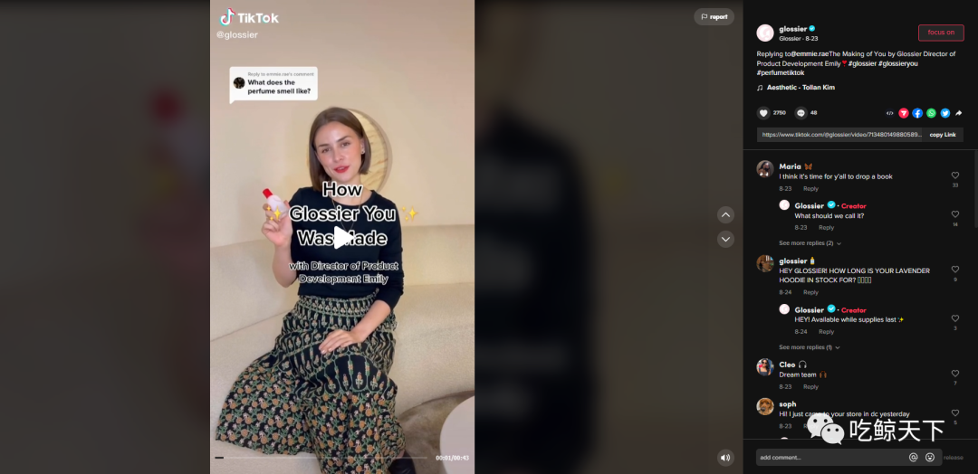 为了进一步增加品牌在TikTok上的曝光,GlossierRep 邀请女孩和男孩们可以通过视频或文字分享自己的爱用单品。如果他们的内容能成功带货,Glossier则会支付一定比例的佣金。