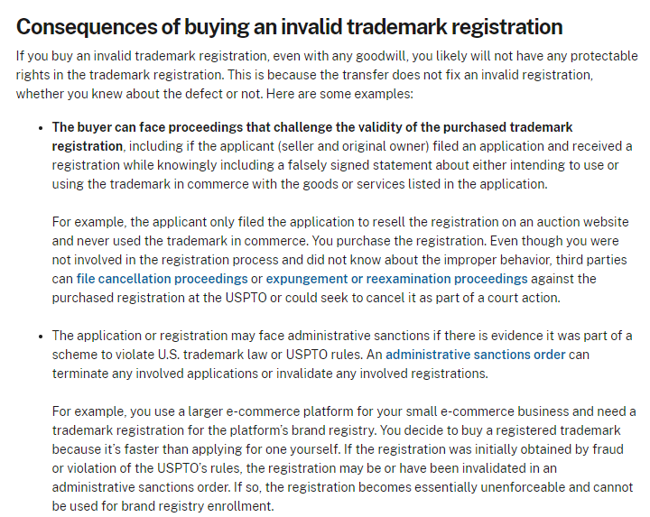1. 买方可能因该注册商标购买的合法性受到质疑而面临被撤销的风险。包括如果商标申请人(卖方或商标原持有人)在申请商标注册时,故意提交包含虚假签名的声明文件,声明打算在商业中使用或在申请中列出的商品或服务中使用该商标。