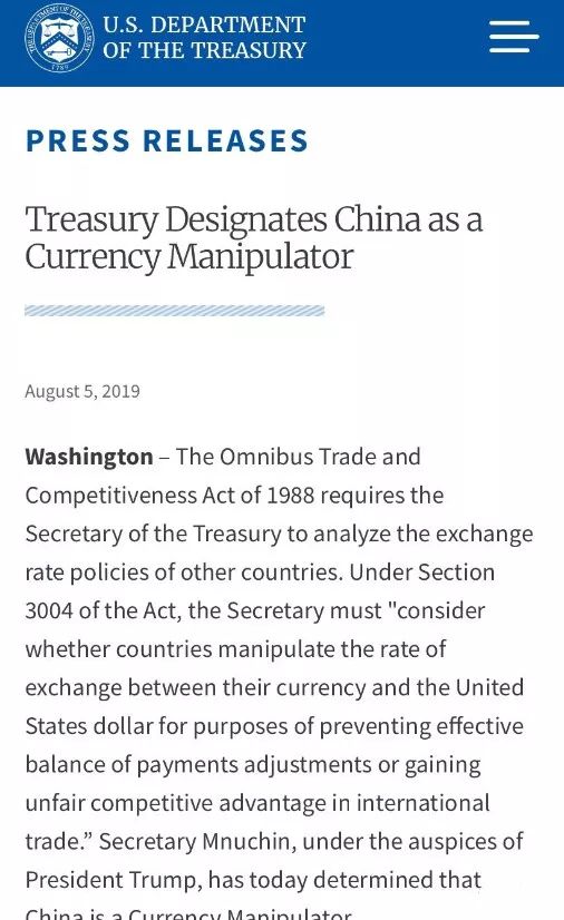 北京时间2019年8月6日凌晨,美国财政部出了这张握了很久的牌:宣布将中国列为汇率操纵国。