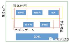 实际上大家对游戏的分类并没有明确的界限,各国常用分类习惯也差异很大,需先将其研究透彻才能言其它。先说国内,我们说的“休闲游戏”有狭义和广义两种,广义上的“休闲游戏”指能简单上手、不需要花费太多时间精力、随时可以停止的所有游戏,这个范围非常广。而说的最多的实际上是狭义的“休闲游戏”,它单指三类游戏,消除类如俄罗斯方块、祖玛、2048、三消、连连看等;以及跑酷类和io类。其并不包括如数独游戏的益智类和解密类。和我们不同的是,在日语语境里并没有“休闲游戏”这样的分类,只有“パズルゲーム(即我们常说的puzzle game)”这个类别,其内涵是益智解密类和消除类,而跑酷类和io类却又不在此列。结合中日的不同情况,这篇文章将要讨论的“休闲游戏”的范围是消除类、跑酷类、io类、轻度解密类和益智类。