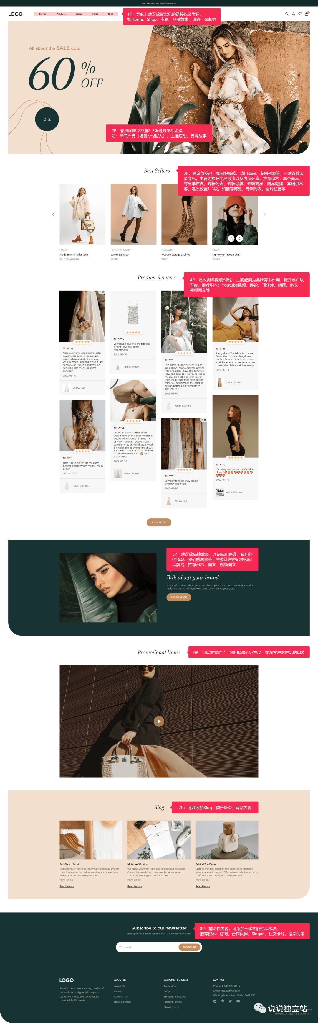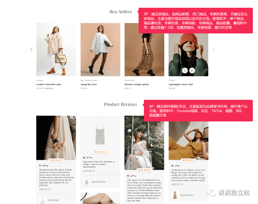 影响独立站转化率6大因素:产品、素材、受众、落地页、结算流程、复购。MiLi今天就来分享下,独立站高转化首页如何装修?整个网站首页框架应该放置什么内容? 传统首页设计:首页全是产品推荐,没有调性,像批发市场,不突出品牌,客户无法记住品牌。 1P:导航上建议放置常见的链接以及类目,如Home、Shop、专辑、品牌故事、博客、条款。 3P:建议放商品如网站新款、热门商品,专辑列表等,不建议放太多商品主要为提升商品导流以及内页分流。推荐积木:单个商品商品瀑布流专辑列表、专辑导航、专辑商品、 商品轮播、基础积木等,建议放置1-3块,如推荐商品专辑列表、图片栏目等。 4P:建议测评视频、评论,主要起到为品牌背书作用,提升客户认可度。推荐积木:Youtube视频评论、TikTok晒图、INS视频图文等。3P和4P参考效果如图↓ 8P:辅助性内容,可添加一些功能性积木块。推荐积木:订阅、合作伙伴、Slogan、社交卡片、搜索词等。7P和8P参考效果如图↓ 除此之外,还要完善首页基础模块:Logo、底部版权、隐私条款政策、客服聊天工具、设置社媒账号等。
