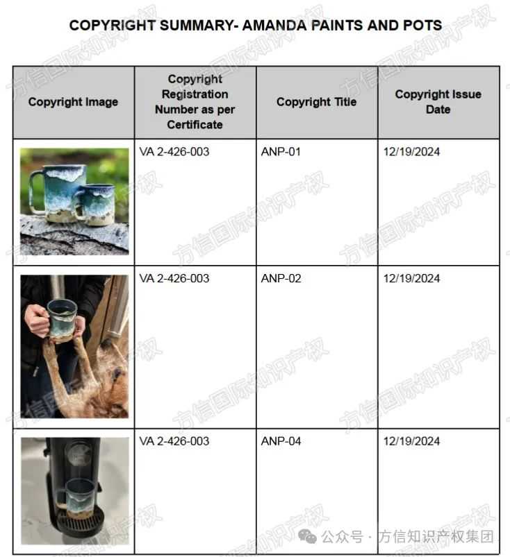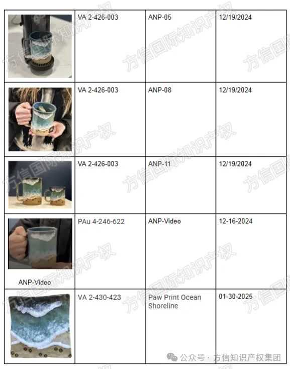 本案所涉及的一款产品爪印海洋海岸线马克杯,共8幅版权图维权,版权号为VA 2-430-423、VA 2-426-003及Pau 4-246-622;跨境卖家需警惕潜在风险!
